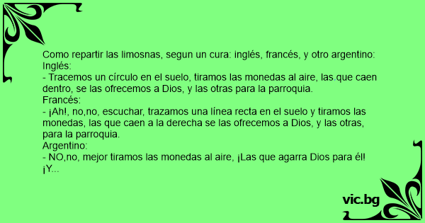 - ¡Ah!, no,no, escuchar, trazamos una línea recta en el suelo y tiramos las monedas, las que caen a la derecha se las ofrecemos a Dios, y las otras, para la parroquia.