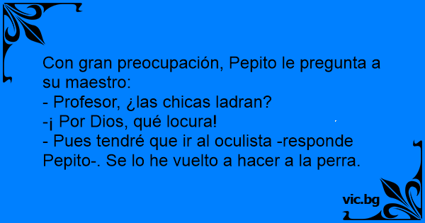 - Pues tendré que ir al oculista -responde Pepito-. Se lo he vuelto a hacer a la perra.