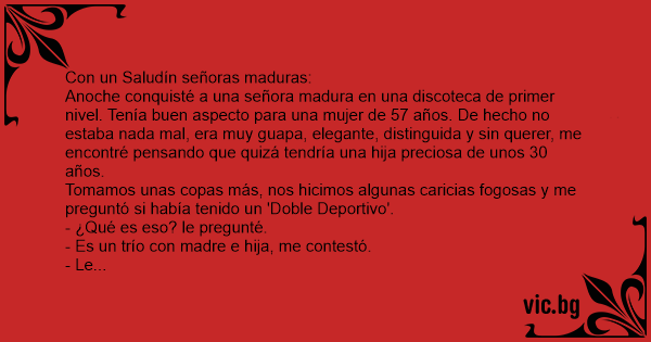 Anoche conquisté a una señora madura en una discoteca de primer nivel. Tenía buen aspecto para una mujer de 57 años. De hecho no estaba nada mal, era muy guapa, elegante, distinguida y sin querer, me encontré pensando que quizá tendría una hija preciosa de unos 30 años.