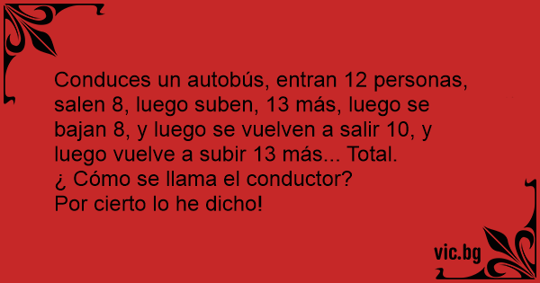 Conduces un autobús, entran 12 personas, salen 8, luego suben, 13 más, luego se bajan 8, y luego se vuelven a salir 10, y luego vuelve a subir 13 más... Total.