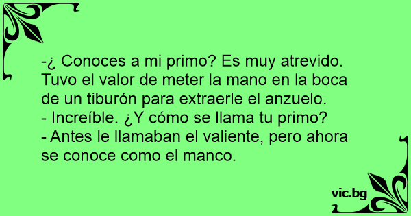 -¿ Conoces a mi primo? Es muy atrevido. Tuvo el valor de meter la mano en la boca de un tiburón para extraerle el anzuelo.