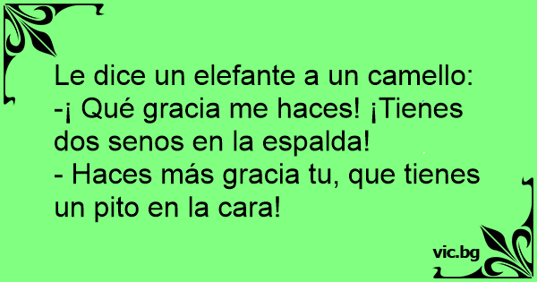 Det var en kamel og en elefant som sto og snakket sammen, da sa elefanten til kamelen: - Du har pupper på ryggen. - Sier du som har tissefanten i tryne, svarte kamelen.