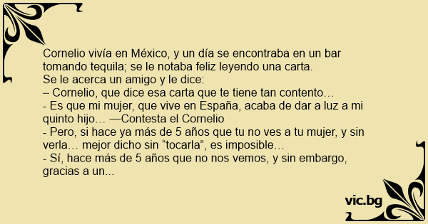 Cornelio vivía en México, y un día se encontraba en un bar tomando tequila; se le notaba feliz leyendo una carta.