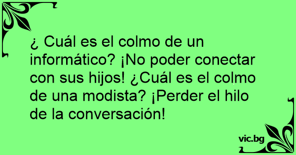 ¿ Cuál es el colmo de un informático? ¡No poder conectar соn sus hijos! ¿Cuál es el colmo de una modista? ¡Perder el hilo de la conversación!