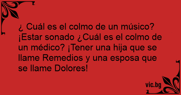 ¿ Cuál es el colmo de un músico? ¡Estar sonado ¿Cuál es el colmo de un médico? ¡Tener una hija que se llame Remedios y una esposa que se llame Dolores!