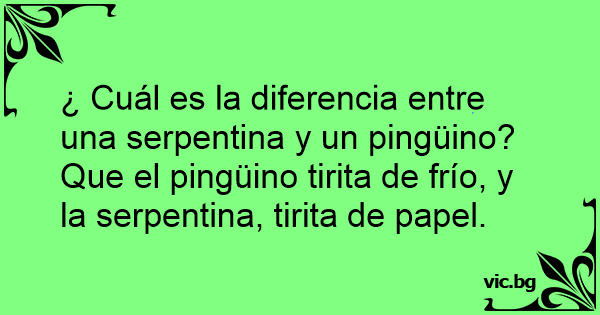 ¿ Cuál es la diferencia entre una serpentina y un pingüino?<br />Que el pingüino tirita de frío, y la serpentina, tirita de papel.