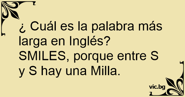 ¿ Cuál es la palabra más larga en Inglés?<br />SMILES, porque entre S y S hay una Milla.
