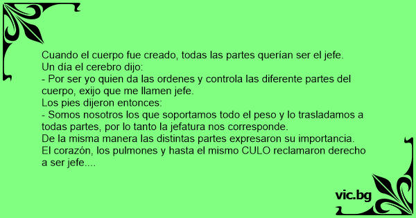 - Por ser yo quien da las ordenes y controla las diferente partes del cuerpo, exijo que me llamen jefe.