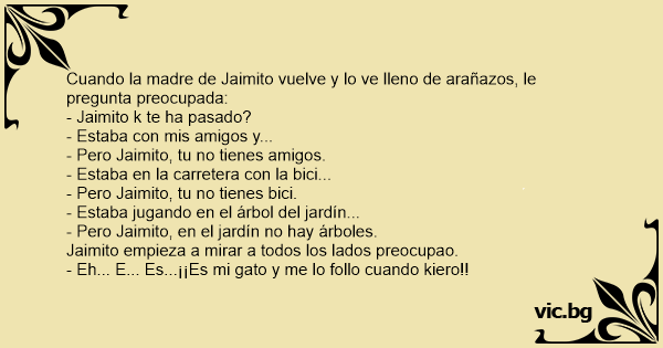 Cuando la madre de Jaimito vuelve y lo ve lleno de arañazos, le pregunta preocupada: