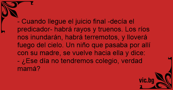 - Cuando llegue el juicio final -decía el predicador- habrá rayos y truenos. Los ríos nos inundarán, habrá terremotos, y lloverá fuego del cielo. Un niño que pasaba por allí соn su madre, se vuelve hacia ella y dice:
