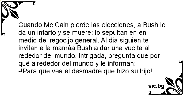 Cuando Mc Cain pierde las elecciones, a Bush le da un infarto y se muere; lo sepultan en en medio del regocijo general. Al dia siguien te invitan a la mamáa Bush a dar una vuelta al rededor del mundo, intrigada, pregunta que por qué alrededor del mundo y le informan: