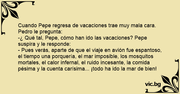 Cuando Pepe regresa de vacaciones trae muy mala cara. Pedro le pregunta: