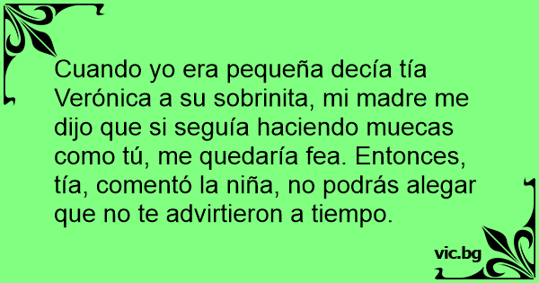 Cuando yo era pequeña decía tía Verónica a su sobrinita, mi madre me dijo que si seguía haciendo muecas como tú, me quedaría fea. Entonces, tía, comentó la niña, no podrás alegar que no te advirtieron a tiempo.