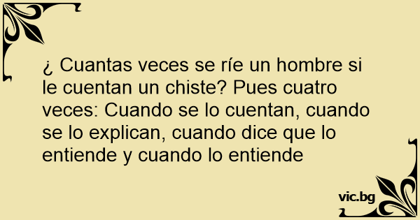 ¿ Cuantas veces se ríe un hombre si le cuentan un chiste? Pues cuatro veces: Cuando se lo cuentan, cuando se lo explican, cuando dice que lo entiende y cuando lo entiende