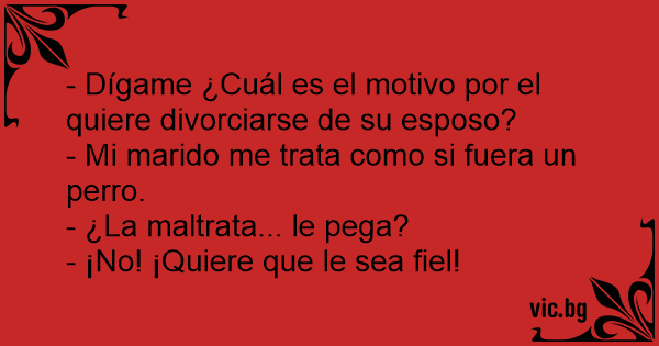 En el Juzgado:,- Pero señora ¿por qué se quiere divorciar? ,- Mi marido me trata como a un perro.,- ¿Le pega, la maltrata? ,- NO, quiere que le sea fiel!!