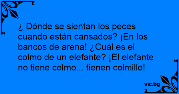 ¿ Dónde se sientan los peces cuando están cansados? ¡En los bancos de arena! ¿Cuál es el colmo de un elefante? ¡El elefante no tiene colmo... tienen colmillo!