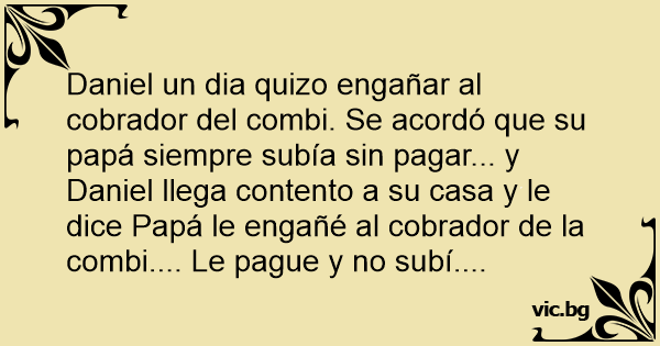 Daniel un dia quizo engañar al cobrador del combi. Se acordó que su papá siempre subía sin pagar... y Daniel llega contento a su casa y le dice Papá le engañé al cobrador de la combi.... Le pague y no subí....