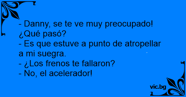 Hola Matías te veo muy preocupado que pasó. - Es que casi atropello a mi suegra. - ¿Qué te fallaron los frenos? - No, no el acelerador...