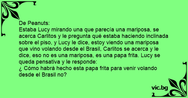 Estaba Lucy mirando una que parecía una mariposa, se acerca Carlitos y le pregunta qué estaba haciendo inclinada sobre el piso, y Lucy le dice, estoy viendo una mariposa que vino volando desde el Brasil, Carlitos se acerca y le dice, eso no es una mariposa, es una papa frita. Lucy se queda pensativa y le responde:
