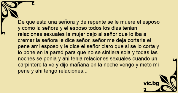 De que esta una señora y de repente se le muere el esposo y como la señora y el esposo todos los dias tenian relaciones sexuales la mujer dejo al señor que lo iba a cremar la señora le dice señor, señor me deja cortarle el pene ami esposo y le dice el señor claro que si se lo corta y lo pone en la pared para que no se sintiera sola y todas las noches se ponia y ahi tenia relaciones sexuales cuando un carpintero la ve y dijo mañana en la noche vengo y meto mi pene y ahi tengo relaciones sexuales соn la señora llega en la noche y el el señor mete su pene y la señora llega соn un cuchillo y dice ni modo nos tenemos que mudar y se lo corto al señor.