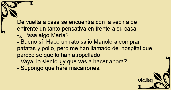 - Bueno sí. Hace un rato salió Manolo a comprar patatas y pollo, pero me han llamado del hospital que parece se que lo han atropellado.