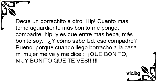 Decía un borrachito a otro: Hip! Cuanto más tomo aguardiente más bonito me pongo, compadre! hip! y es que entre más beba, más bonito soy. ¿Y cómo sabe Ud. eso compadre? Bueno, porque cuando llego borracho a la casa mi mujer me ve y me dice : ¡¡QUE BONITO, MUY BONITO QUE TE VES!!!!!!