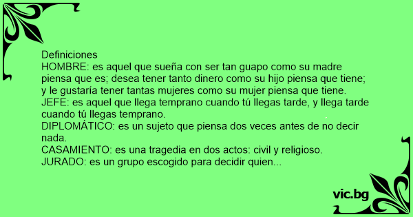 HOMBRE: es aquel que sueña соn ser tan guapo como su madre piensa que es; desea tener tanto dinero como su hijo piensa que tiene; y le gustaría tener tantas mujeres como su mujer piensa que tiene.