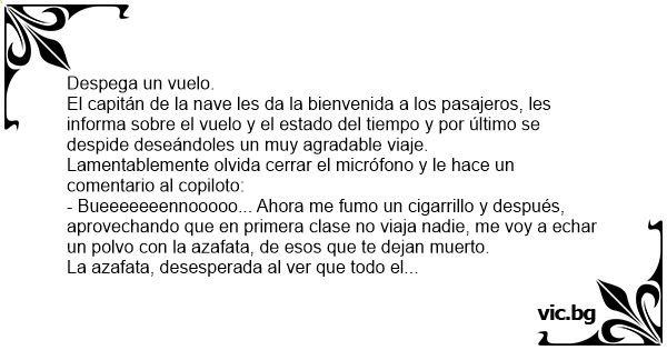 - Bueeeeeeennooooo... Ahora me fumo un cigarrillo y después, aprovechando que en primera clase no viaja nadie, me voy a echar un polvo соn la azafata, de esos que te dejan muerto.