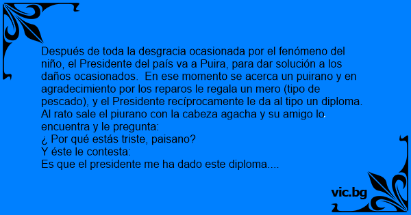 Después de toda la desgracia ocasionada por el fenómeno del niño, el Presidente del país va a Puira, para dar solución a los daños ocasionados. En ese momento se acerca un puirano y en agradecimiento por los reparos le regala un mero (tipo de pescado), y el Presidente recíprocamente le da al tipo un diploma.
