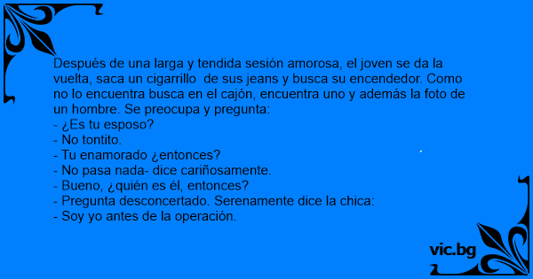 Después de una larga y tendida sesión amorosa, el joven se da la vuelta, saca un cigarrillo de sus jeans y busca su encendedor. Como no lo encuentra busca en el cajón, encuentra uno y además la foto de un hombre. Se preocupa y pregunta: