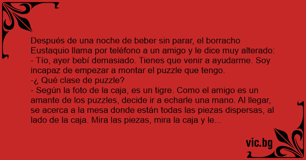 - Tío, ayer bebí demasiado. Tienes que venir a ayudarme. Soy incapaz de empezar a montar el puzzle que tengo.