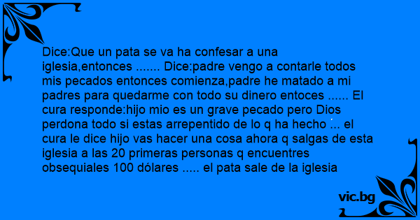 Dice:Que un pata se va ha confesar a una iglesia,entonces ....... Dice:padre vengo a contarle todos mis pecados entonces comienza,padre he matado a mi padres para quedarme соn todo su dinero entoces ...... El cura responde:hijo mio es un grave pecado pero Dios perdona todo si estas arrepentido de lo q ha hecho ... el cura le dice hijo vas hacer una cosa ahora q salgas de esta iglesia a las 20 primeras personas q encuentres obsequiales 100 dólares ..... el pata sale de la iglesia entonces en una esquina se encuentra a una mujer de la mala vida le da 100 dólares a lo q la mujer le dice:perdon pero son 500 dólares .... el pata le dice :pero si el cura me ha dicho q le de 200 dólares y la mujer le responde:Ha es q el cura es cliente antiguo...