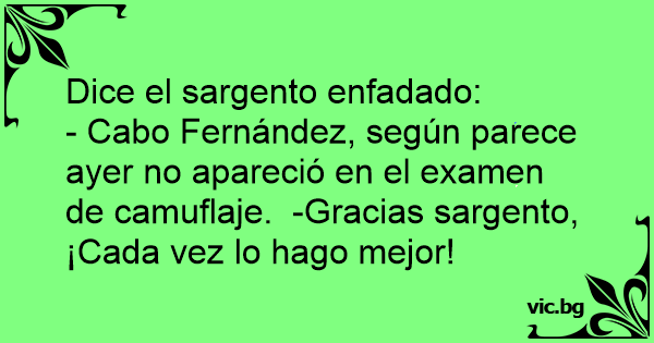 - Cabo Fernández, según parece ayer no apareció en el examen de camuflaje. -Gracias sargento, ¡Cada vez lo hago mejor!