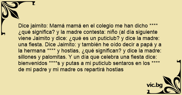 Dice jaimito: Mamá mamá en el colegio me han dicho **** ¿qué significa? y la madre contesta: niño (al día siguiente viene Jaimito y dice: ¿qué es un puticlub? y dice la madre: una fiesta. Dice Jaimito: y también he oído decir a papá y a la hermana **** y hostias, ¿qué significan? y dice la madre: sillones y palomitas. Y un día que celebra una fiesta dice: bienvenidos ****s y putas a mi puticlub sentaros en los **** de mi padre y mi madre os repartirá hostias