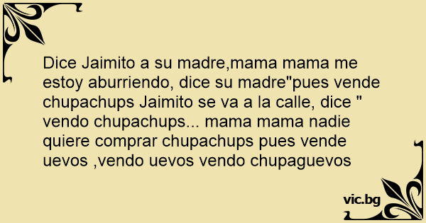 Dice Jaimito a su madre,mama mama me estoy aburriendo, dice su madre"pues vende chupachups Jaimito se va a la calle, dice " vendo chupachups... mama mama nadie quiere comprar chupachups pues vende uevos ,vendo uevos vendo chupaguevos
