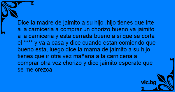 Dice la madre de jaimito a su hijo ,hijo tienes que irte a la carniceria a comprar un chorizo bueno va jaimito a la carniceria y esta cerrada bueno a si que se corta el **** y va a casa y dice cuando estan comiendo que bueno esta, luego dice la mama de jaimito a su hijo tienes que ir otra vez mañana a la carniceria a comprar otra vez chorizo y dice jaimito esperate que se me crezca