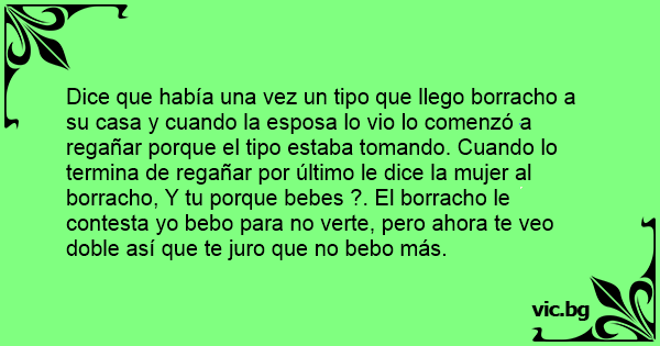 Dice que había una vez un tipo que llego borracho a su casa y cuando la esposa lo vio lo comenzó a regañar porque el tipo estaba tomando. Cuando lo termina de regañar por último le dice la mujer al borracho, Y tu porque bebes ?. El borracho le contesta yo bebo para no verte, pero ahora te veo doble así que te juro que no bebo más.