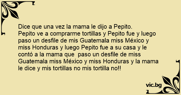 Pepito ve a comprarme tortillas y Pepito fue y luego paso un desfile de mis Guatemala miss México y miss Honduras y luego Pepito fue a su casa y le contó a la mama que paso un desfile de miss Guatemala miss México y miss Honduras y la mama le dice y mis tortillas no mis tortilla no!!