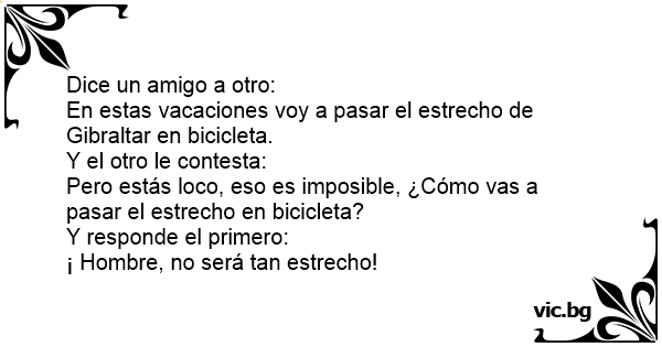 Dice un amigo a otro:<br />En estas vacaciones voy a pasar el estrecho de Gibraltar en bicicleta.<br />Y el otro le contesta:<br />Pero estás lосо, eso es imposible, ¿Cómo vas a pasar el estrecho en bicicleta?<br />Y responde el primero:<br />¡ Hombre, no será tan estrecho!