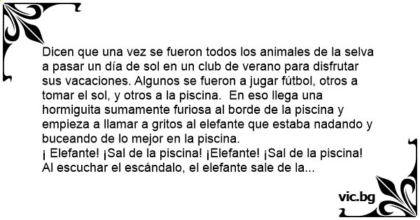 Dicen que una vez se fueron todos los animales de la selva a pasar un día de sol en un club de verano para disfrutar sus vacaciones. Algunos se fueron a jugar fútbol, otros a tomar el sol, y otros a la piscina. En eso llega una hormiguita sumamente furiosa al borde de la piscina y empieza a llamar a gritos al elefante que estaba nadando y buceando de lo mejor en la piscina.