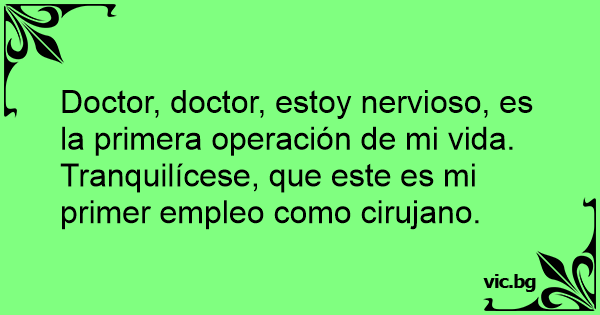 Doctor, doctor, estoy nervioso, es la primera operación de mi vida.<br />Tranquilícese, que este es mi primer empleo como cirujano.