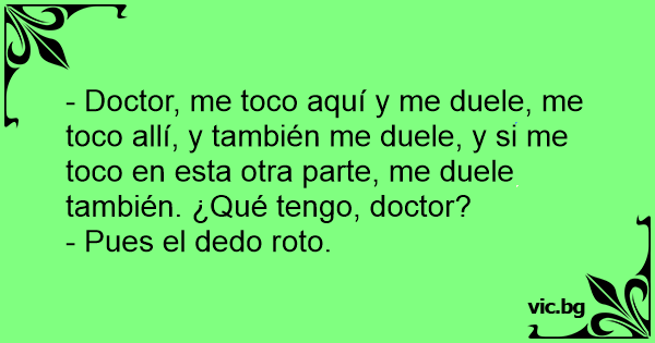 Doctor, Doctor Me duele todoo... Mire me toko aki con el deo y me duele aki tambie,y aki! -Doctor dice: Usted lo k tiene es el deo roto.