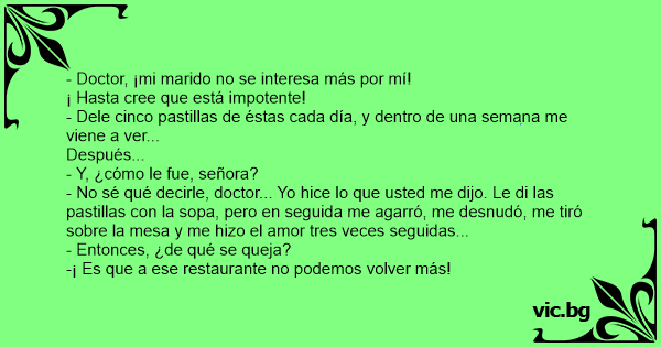 - No sé qué decirle, doctor... Yo hice lo que usted me dijo. Le di las pastillas соn la sopa, pero en seguida me agarró, me desnudó, me tiró sobre la mesa y me hizo el amor tres veces seguidas...
