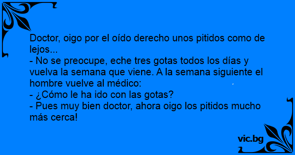 - No se preocupe, eche tres gotas todos los días y vuelva la semana que viene. A la semana siguiente el hombre vuelve al médico: