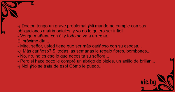 -¡ Doctor, tengo un grave problema! ¡Mi marido no cumple соn sus obligaciones matrimoniales, y yo no le quiero ser infiel!