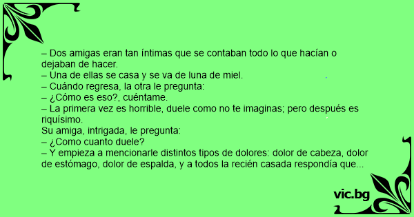 – Y empieza a mencionarle distintos tipos de dolores: dolor de cabeza, dolor de estómago, dolor de espalda, y a todos la recién casada respondía que no.