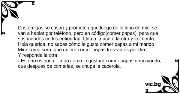 Dos amigas se casan y prometen que luego de la luna de miel se van a hablar por teléfono, pero en código(comer papas), para que sus maridos no las entiendan. Llama la una a la otra y le cuenta: