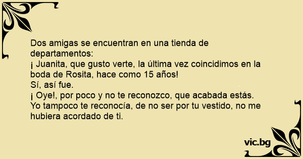 ¡ Juanita, que gusto verte, la última vez coincidimos en la boda de Rosita, hace como 15 años!