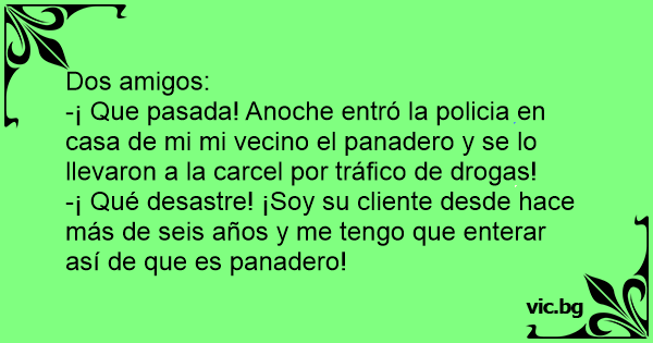 -¡ Que pasada! Anoche entró la policia en casa de mi mi vecino el panadero y se lo llevaron a la carcel por tráfico de drogas!