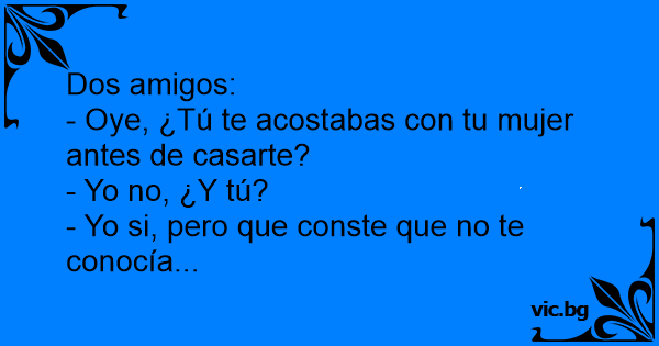 Un amigo a otro: - Tu te acostaste con tu esposa antes de casarte? - Yo no, y tú? - Yo si, pero no sabia que iba ser tu esposa.